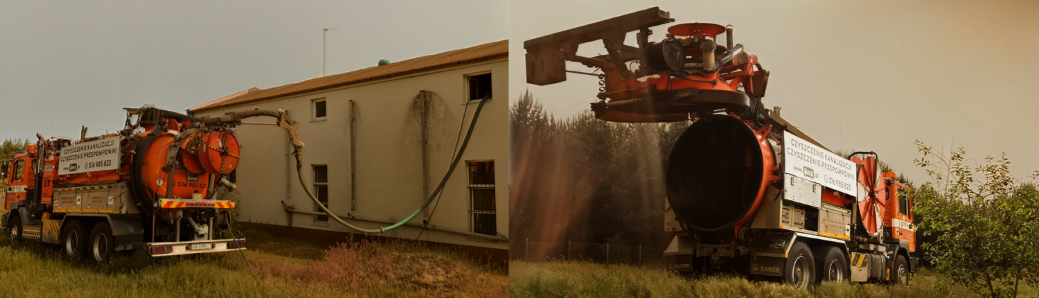 Oferujemy czyszczenie kanalizacji samochodem specjalistycznym ssąco-płuczącym KAISER o wydajności 500l na minutę 200bar z recyklingiem wody.